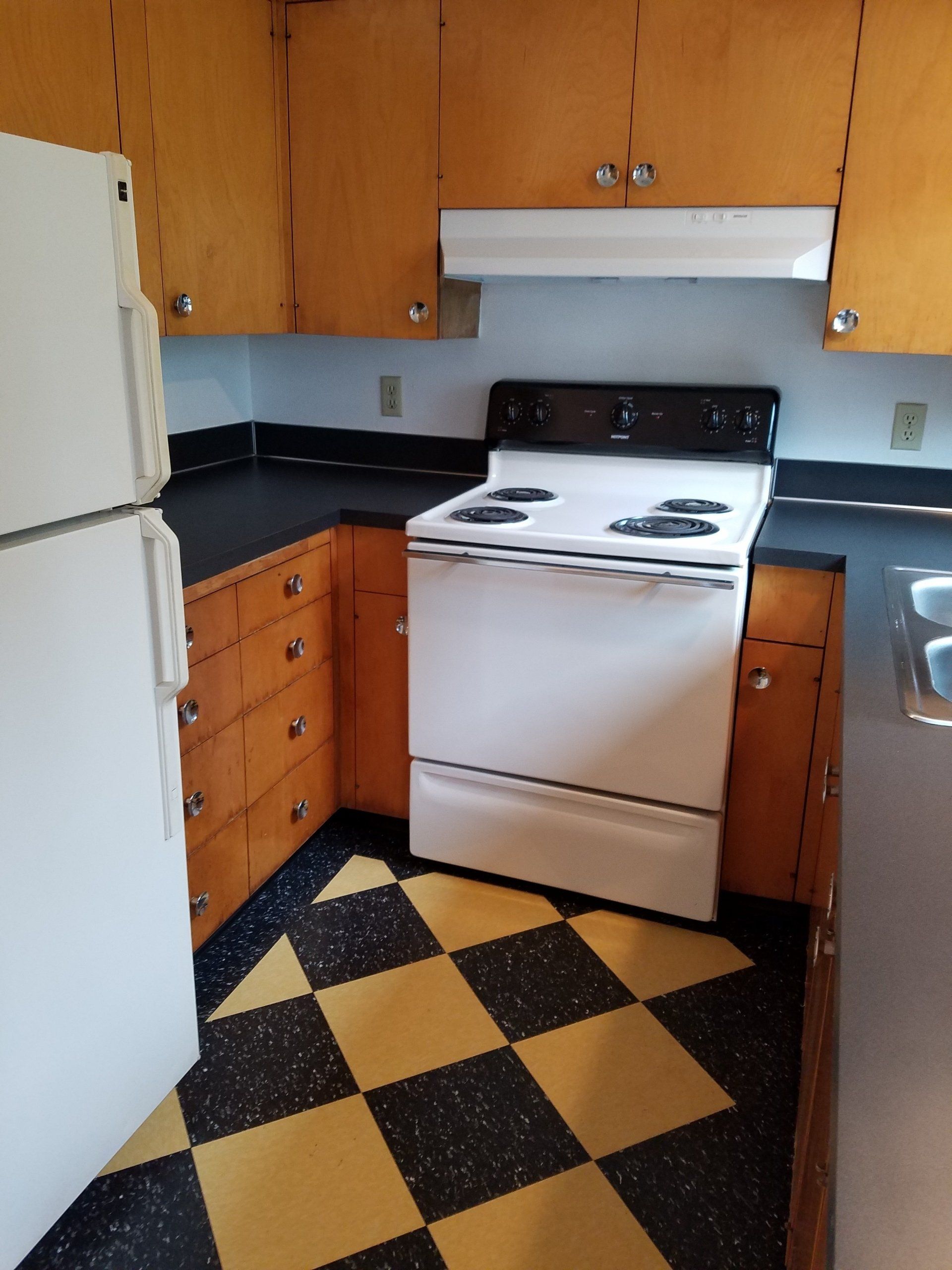 Each apartment has hardwood floors and most baths boast colorful tile some of which is original. The Mid-Century apartments have a typically open floorplan concept for the living room and kitchen areas. Bedrooms also have hardwoods and large windows. Linen closets or large hall closets provide additional storage alternatives. Cats and dogs are welcome on this property with proof of renters insurance.