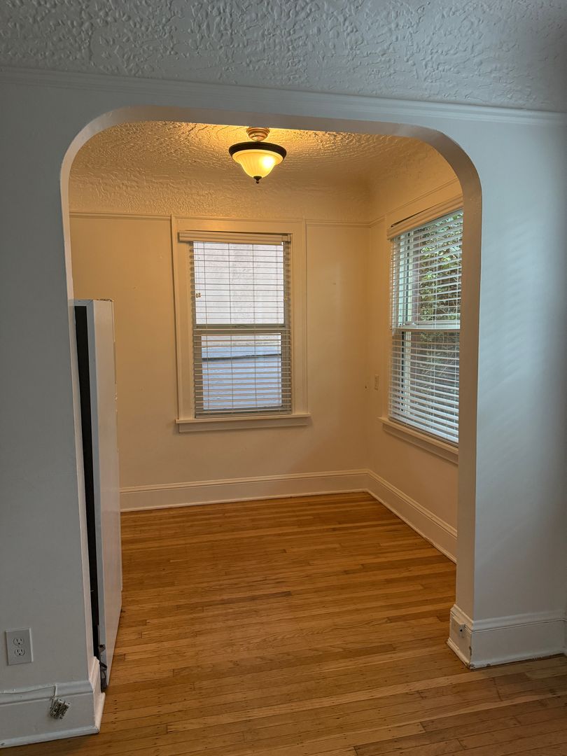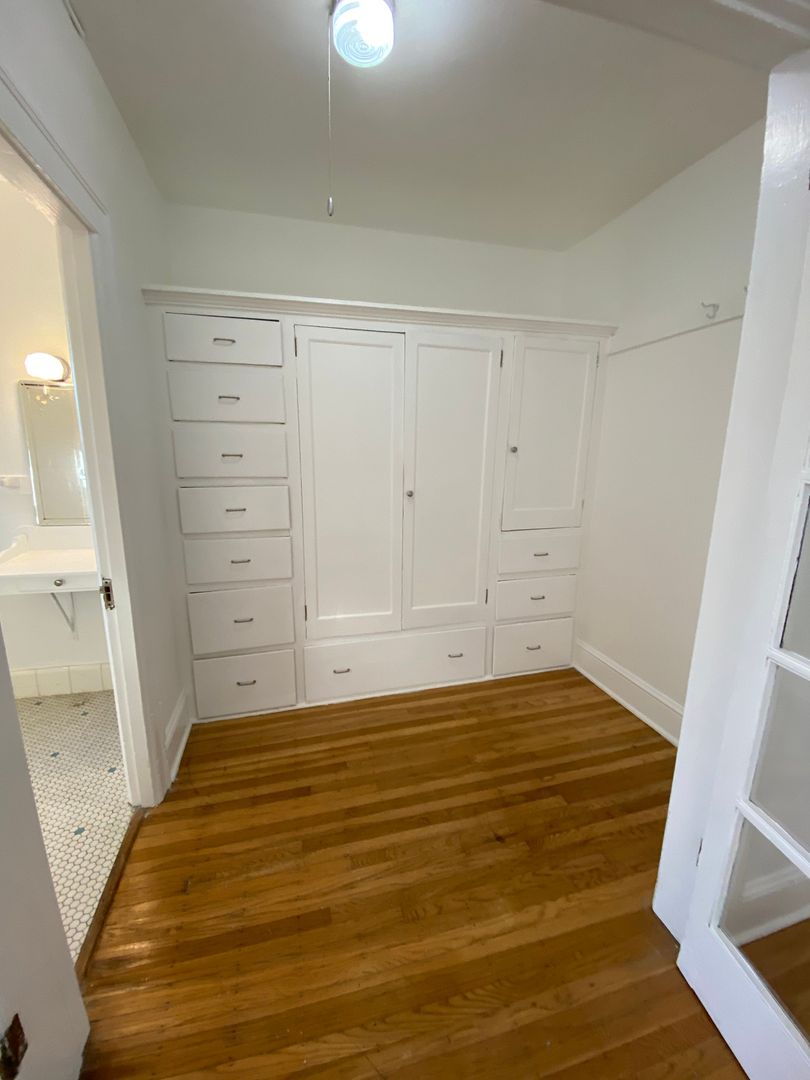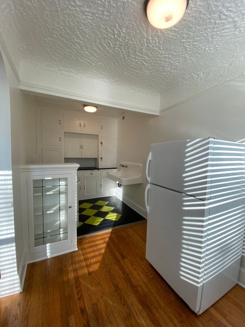 > Unit #205 is on the southwest corner of the building, overlooking the green neighboring space and back walkway. It is on the second level, with French doors separating the living area from bathroom. The afternoon light is sure to set the mood when cooking and hosting! Lots of kitchen storage, built-in cabinetry for the closet, and our Pet Policy make this space desirable for anyone looking to live in Goose Hollow!