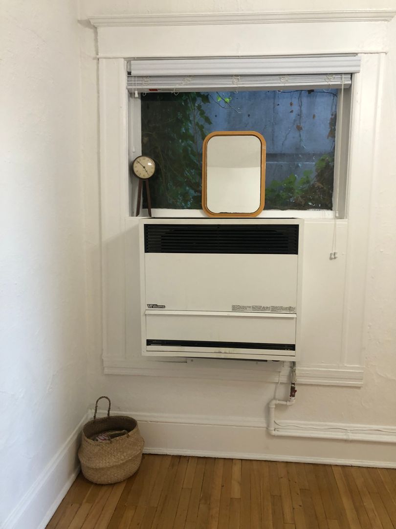 > This unit- exact photos used- has an abundance of windows and views to the west and south of the building. You'll find yourself entering via a long hallway that splits off to bathroom, a spacious kitchen, and then ending in the living room area. The windows in the living area overlook building greenery and the west courtyard beyond the 1-st floor shops. The bathroom along the back corner has a spacious, thin closet and is right next to the gas furnace in the living area!