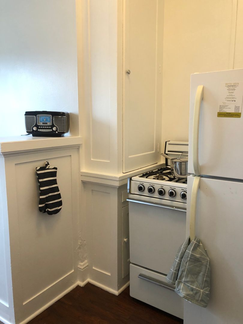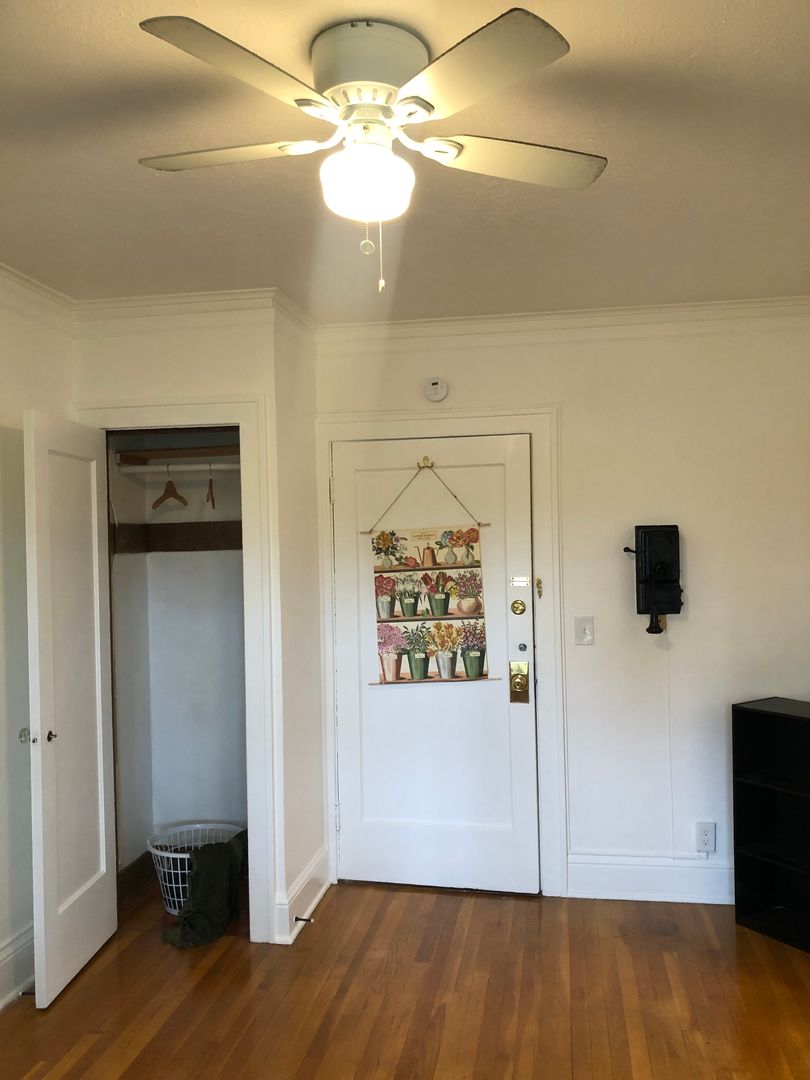 > Unit #204 features a bathroom vanity, two deep closets and a bounty of wall hooks to meet all your storage needs! The building offers gas heating and gas stovetop. The southwestern windows offer natural light streaming through the tall windows all day long! Two ceiling fans keep air cool and circulated year-round. In the kitchen, you'll find the vintage aesthetic peeking through with glass-paned cabinetry that faces the dining area.