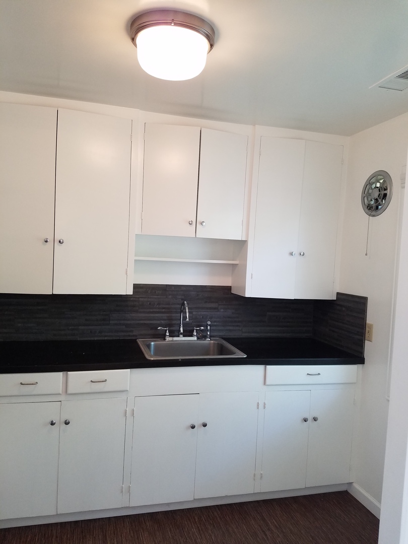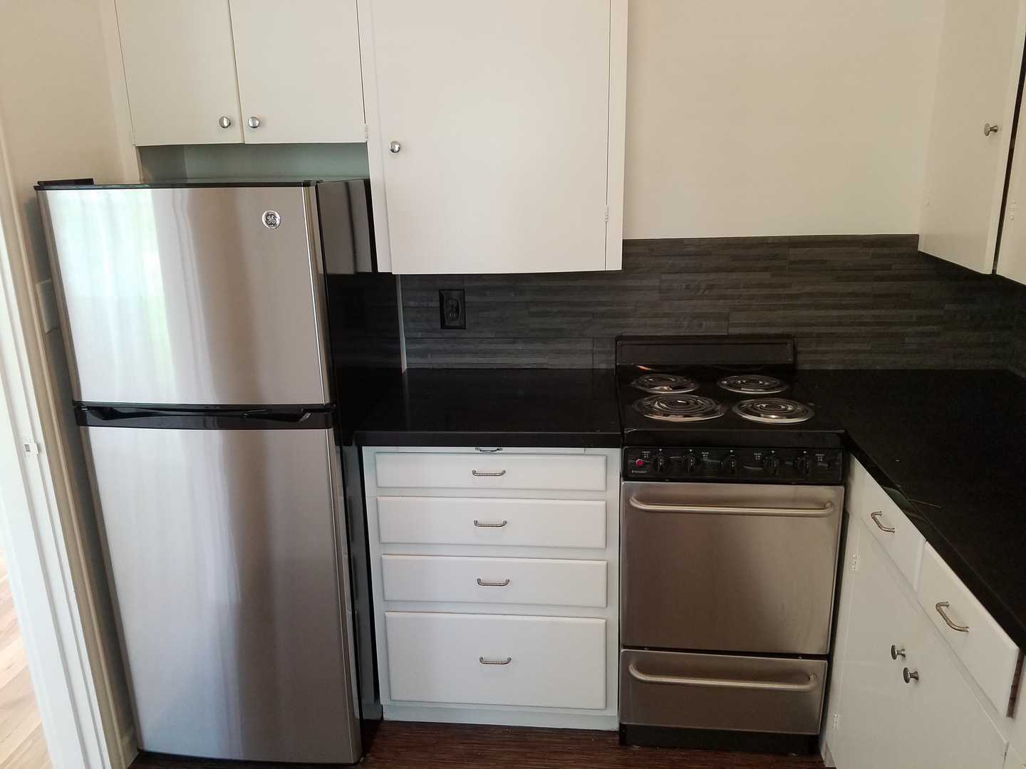 Our largest 1x1 floor plan that includes a den on the top floor, corner of the building. Restored original gleaming hardwoods meets you at the entry and continues throughout. The kitchen has been freshly renovated with ebony quartz countertops with a custom cut slate porcelain backsplash and a stainless-steel appliance package. There is a black crystal chandelier in the dining room to continue the vintage feel with urban appeal.