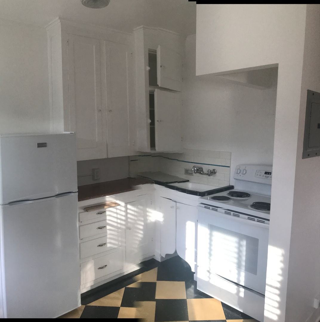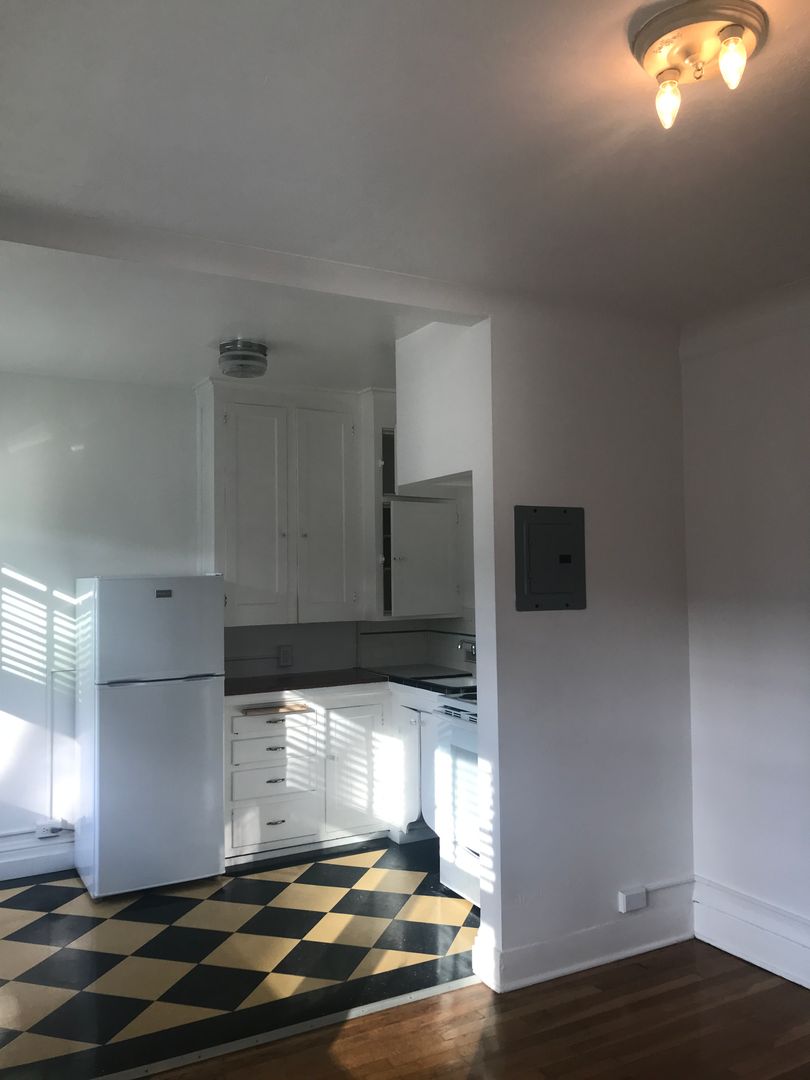 >This outer petite studio offers a view of the west hills, with light streaming in from a wall of windows unblocked by the surrounding neighbors- 4 to be exact! The full-size appliances in the kitchen stand out against with the original tiling and adorable checkerboard flooring. The floorplan shows a walk-in closet: a huge amenity for this space!
