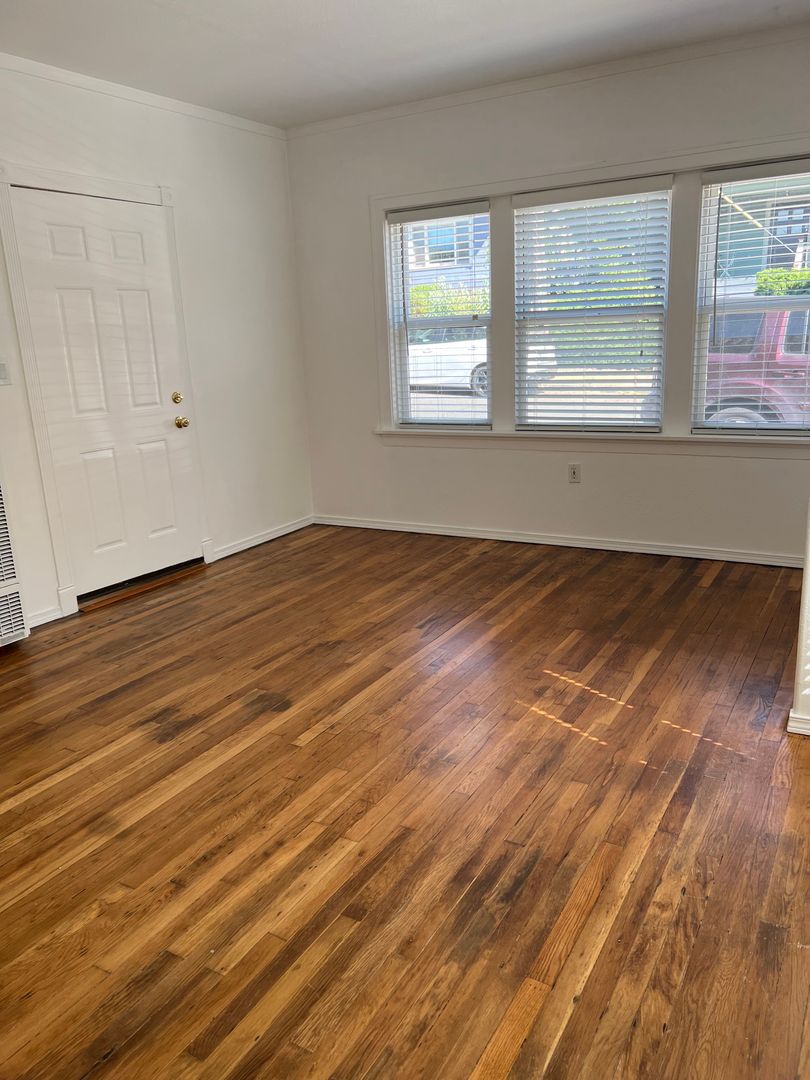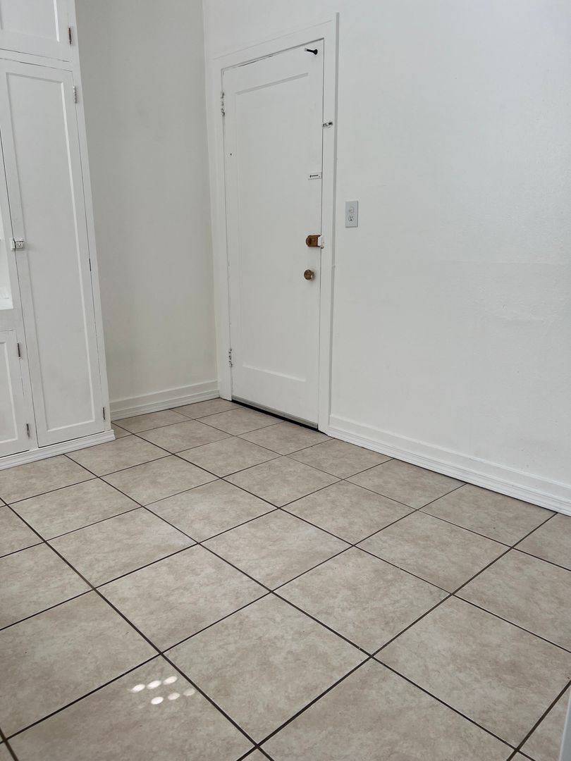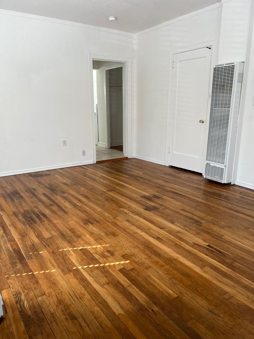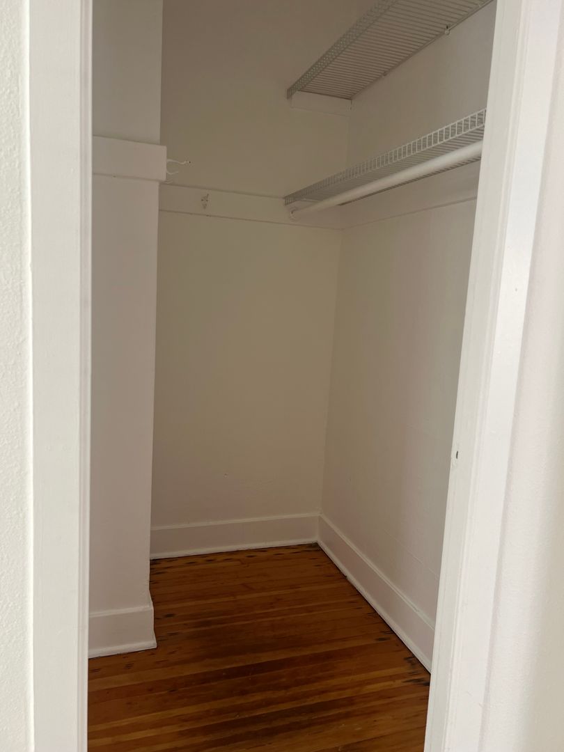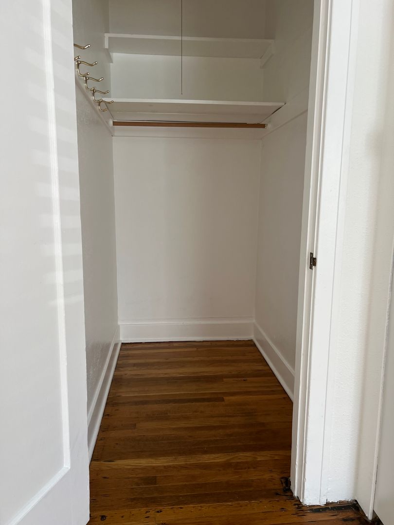 This studio has enormous closet space in the living room as well as the kitchen. Enjoy the courtyard view from the three large windows.