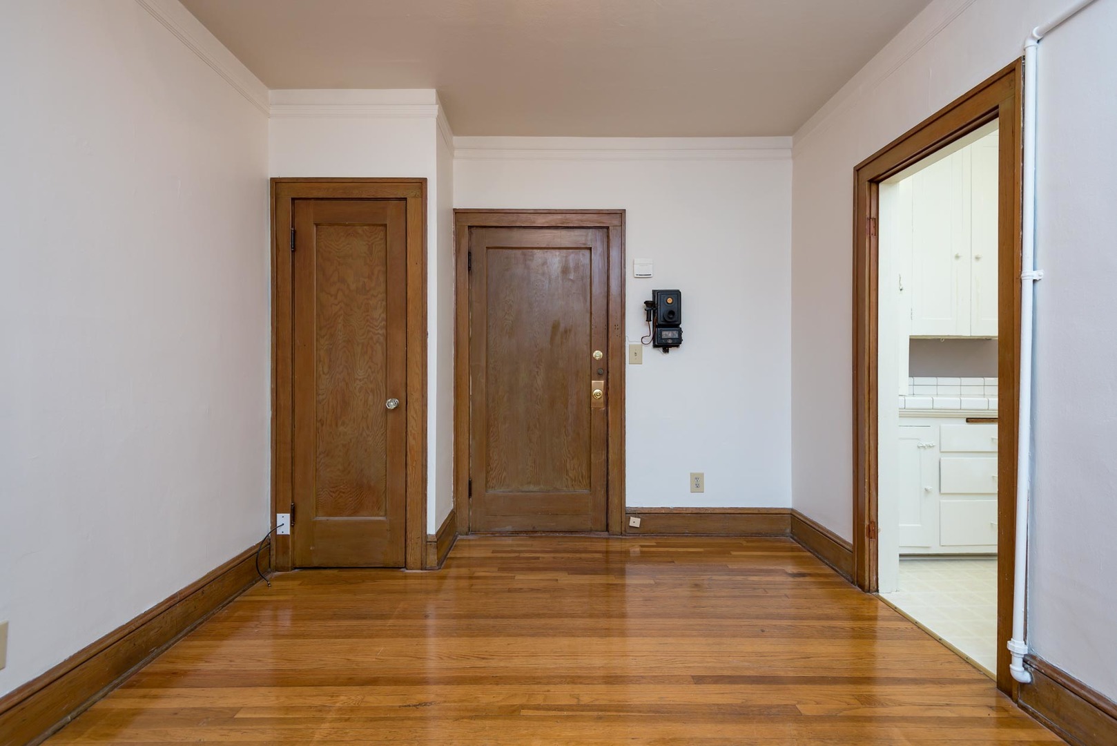 Unit #104 is on the second-floor corner of this beautiful brick-facade building. The tall windows span wide on both northern and eastern walls. The gas heat is comfortable and efficient, and the gas stove- a plus! If you love vintage charm, these studios exude the old Portland feel with original hardwoods, stained crown moulding, and period style lighting... while still offering modern conveniences like our free internet service through FastMesh and multiple closets!