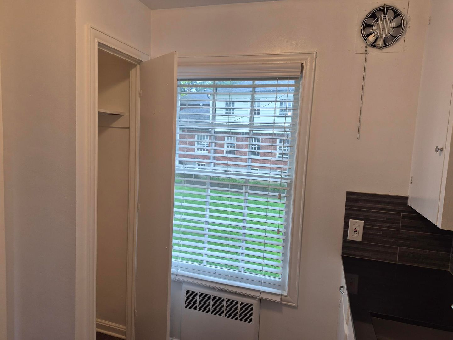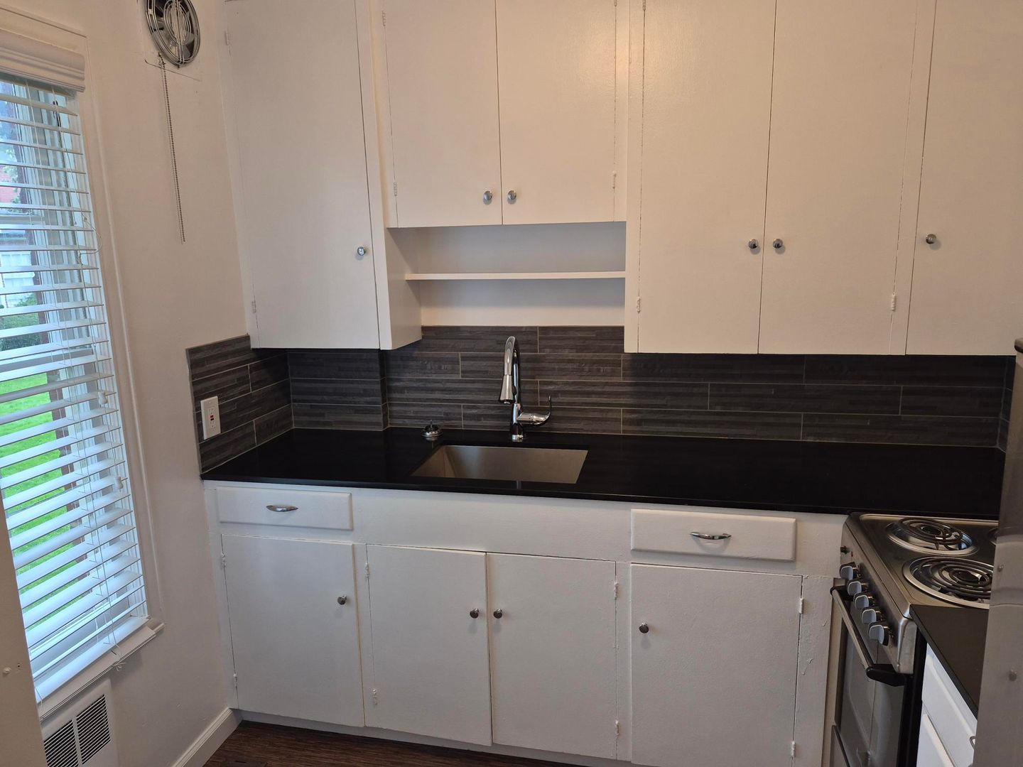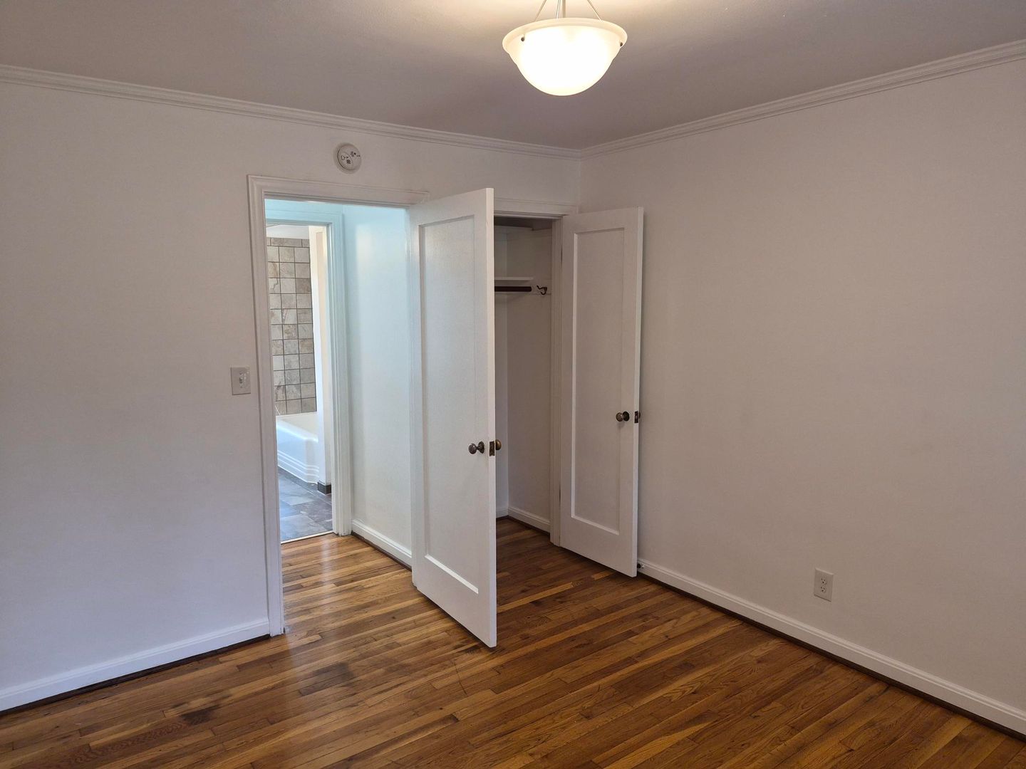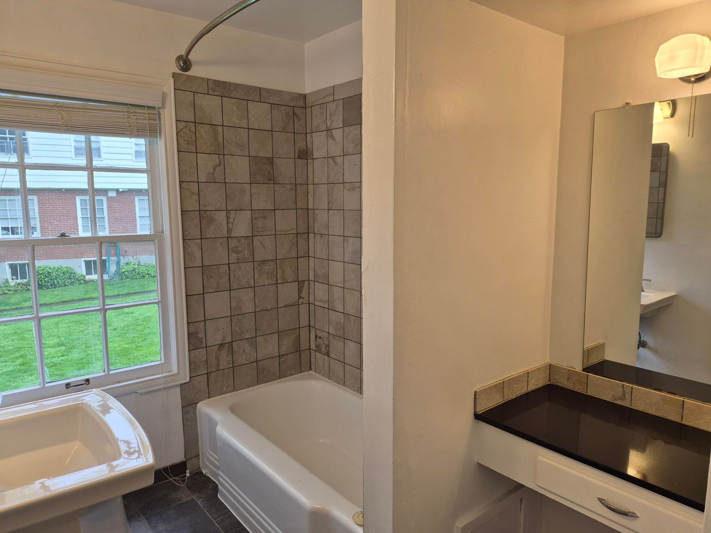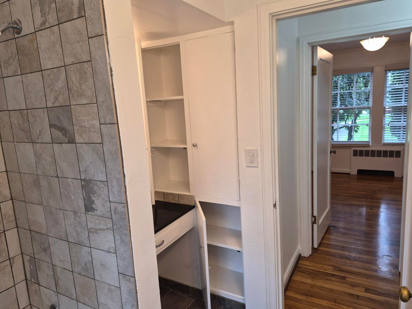 Located on the first floor, garden level of the building. Gleaming restored original hardwood flooring meets you at the entry and continues throughout. The living room has a large bay window with seating and a nook perfect for a dining room or home office with a black and crystal chandelier. The kitchen has been renovated with quartz countertops and slate porcelain tile backsplash, flooring and a stainless-steel appliance package. There is also a closet that can be used as cleaning storage or you can add shelving to make it a pantry. In the bathroom there is a mirrored vanity, hand laid slate tile flooring, tub surround and a linen closet with a pedestal sink. The bedroom has a walk in closet and vintage charm to spare!