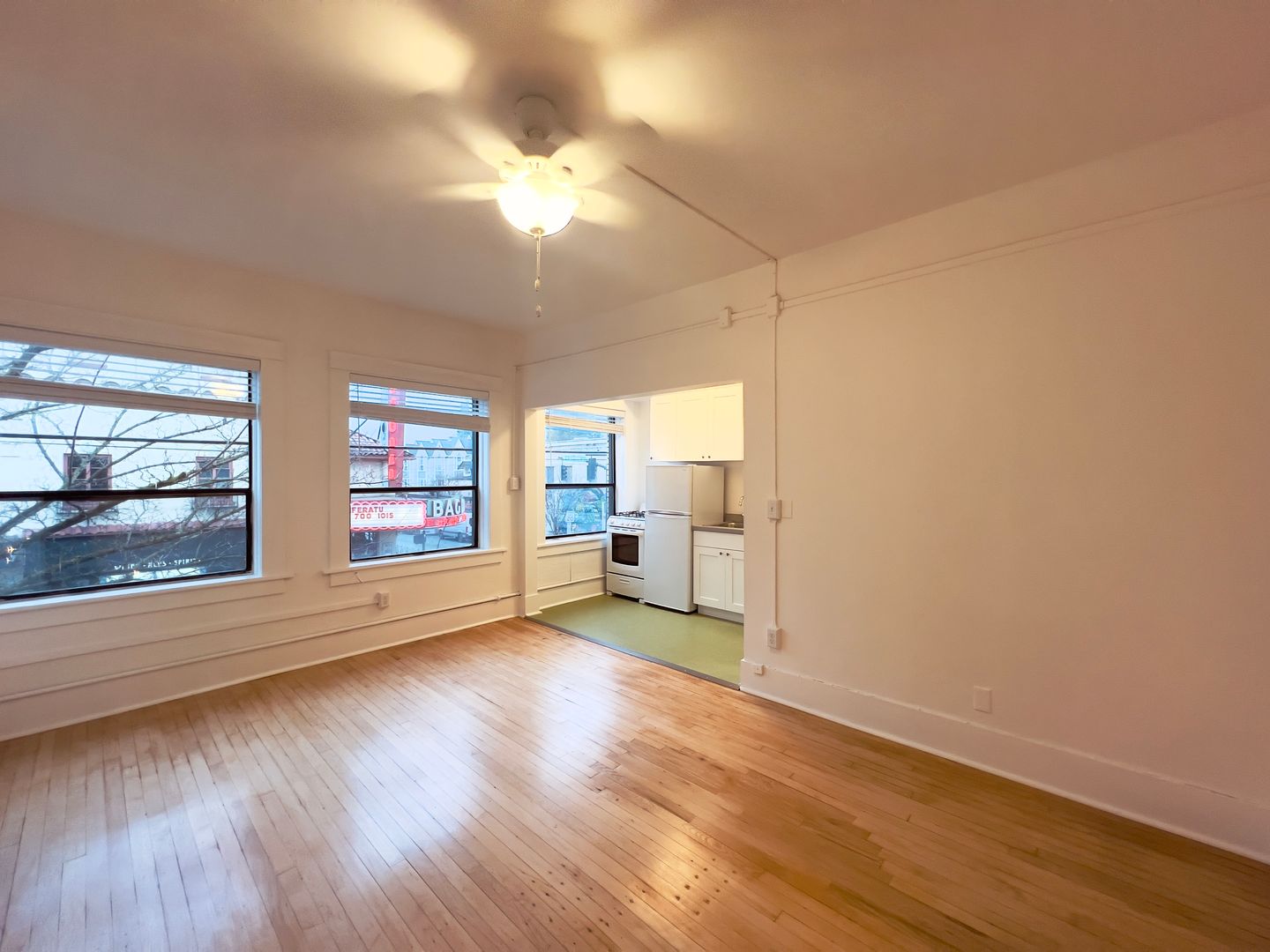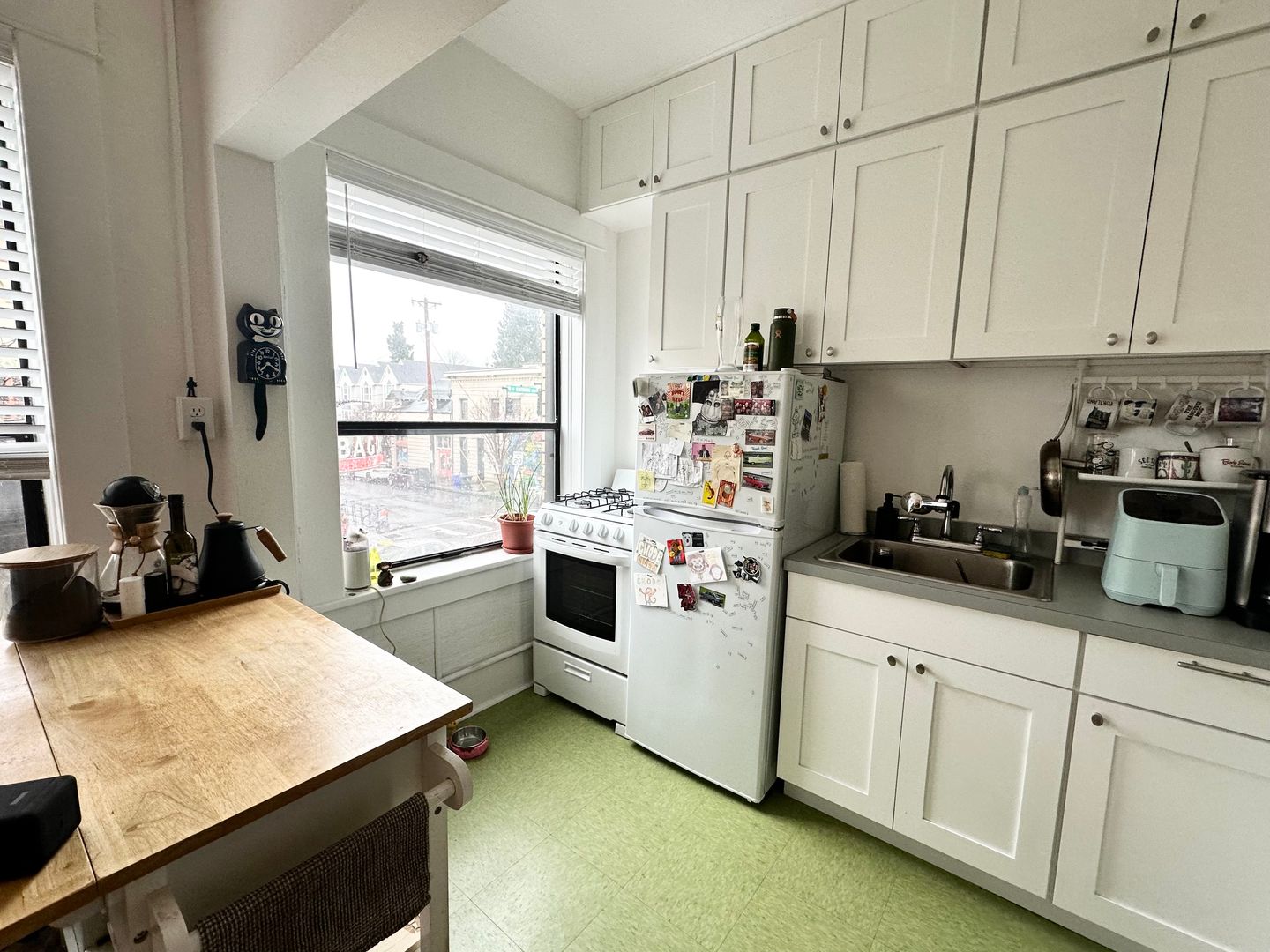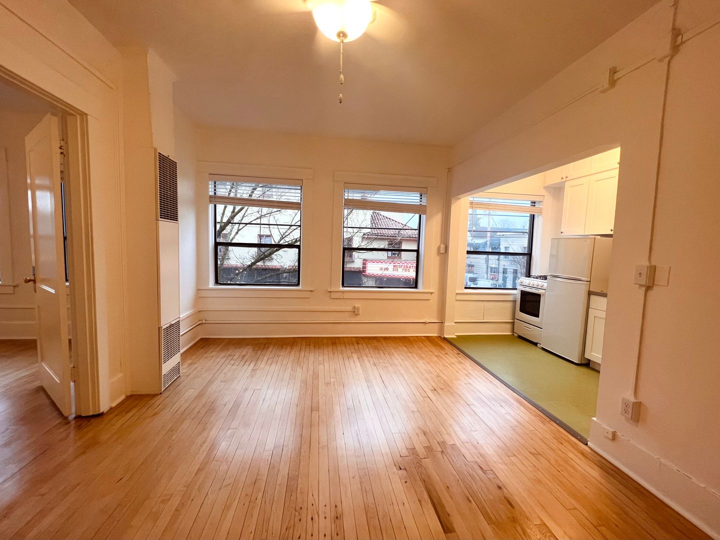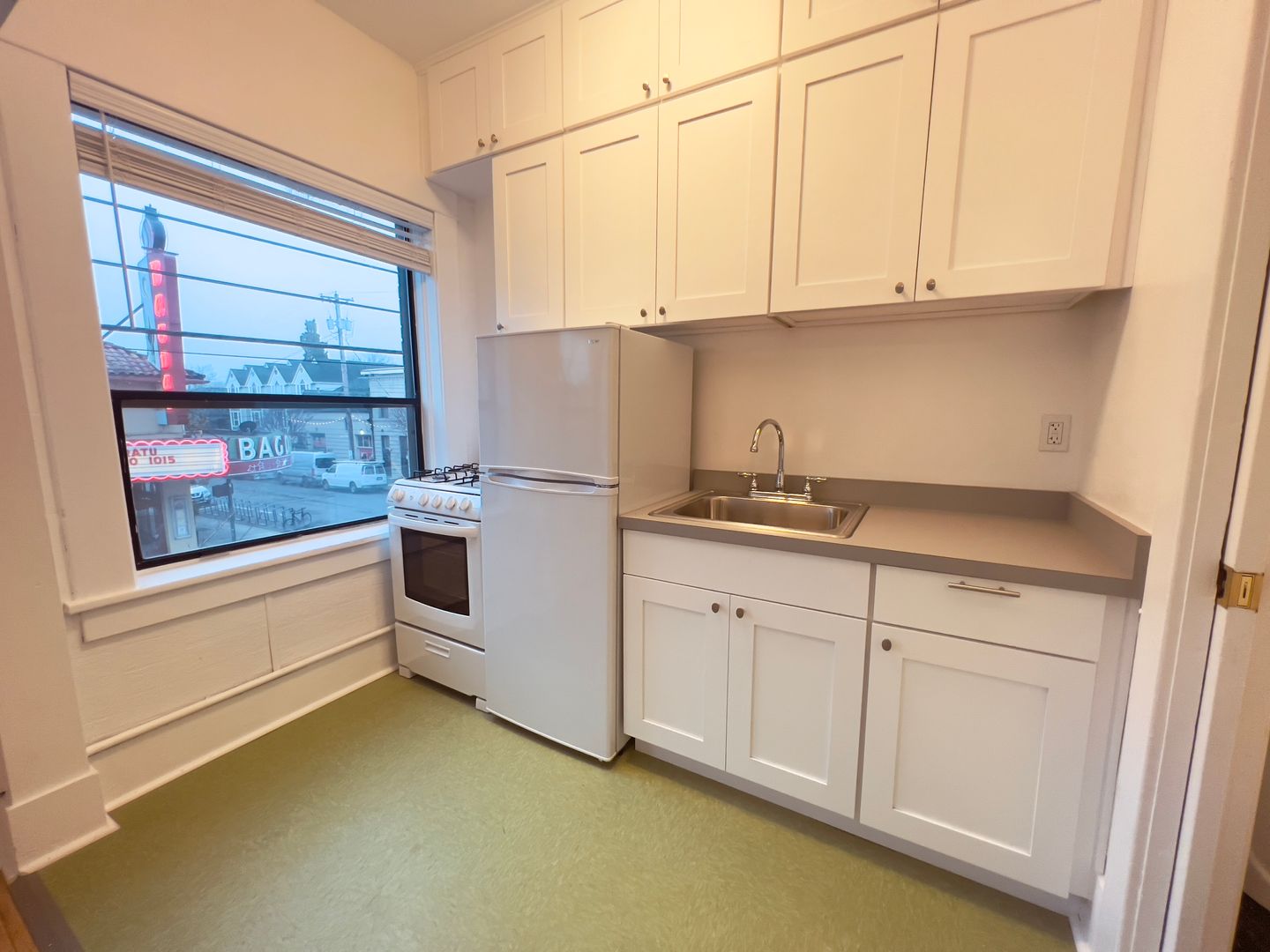 While the apartment retains its historic appeal, it's fresh remodeled kitchen offers modern amenities to ensure your comfort and convenience. The south facing wall of windows floods the space with light and gives a stunning view of the historic Bagdad Theater just across the street!